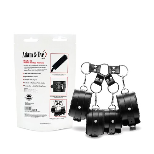 Discover all the ways to play with fur lined wrist & ankle cuffs that restrain your lover for kinky bondage games with the Adam & Eve Hog Tie Kit.