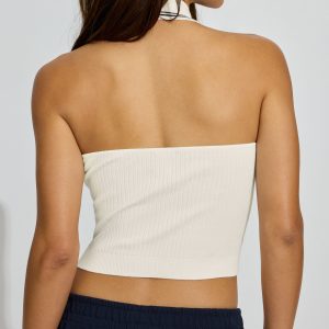 Bare Halter Polo Top White women – This is a next level going out top , we’re obsessed. Features Halter neck spread collar Five button placket Open back Sleeveless Ribbed Size & Fit Fit: Fitted Length: Cropped Materials & Care Content: 70% viscose, 30% nylon Care: Machine wash, cold Imported