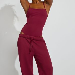 Cageback Bodysuit Burgundy women – This with some comfy sweats riding low… purr!! Features Fixed shoulder straps with cage back detail Square neckline Thong bottom with snap closure Lined bust Very stretchy! Size & Fit Fit: Fitted Model is wearing size S Materials & Care Content: 75% nylon, 25% spandex Care: Machine wash, cold Imported