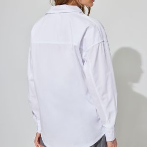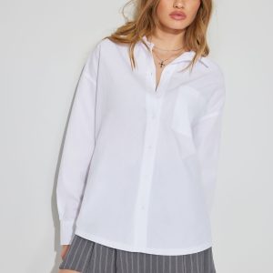 Charlie Button Up Shirt White women – This oversized work shirt is perfect worn open over a little top … think business wayyy casual. Features Spread collar Button closure Breast pocket Shirttail hem Size & Fit Fit: Oversized Length: Regular Model is wearing size S Materials & Care Content: 100% cotton Care: Machine wash, cold Imported