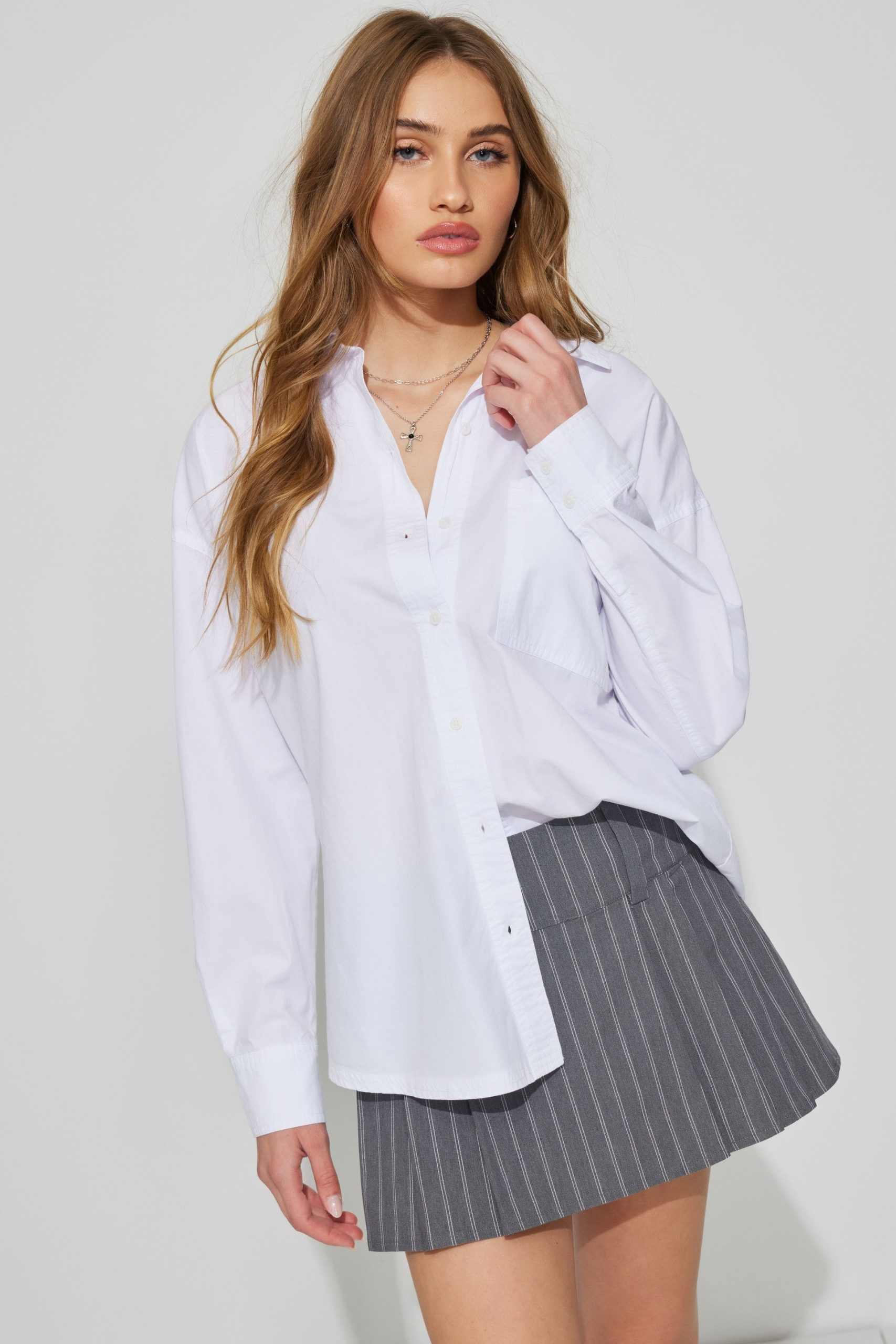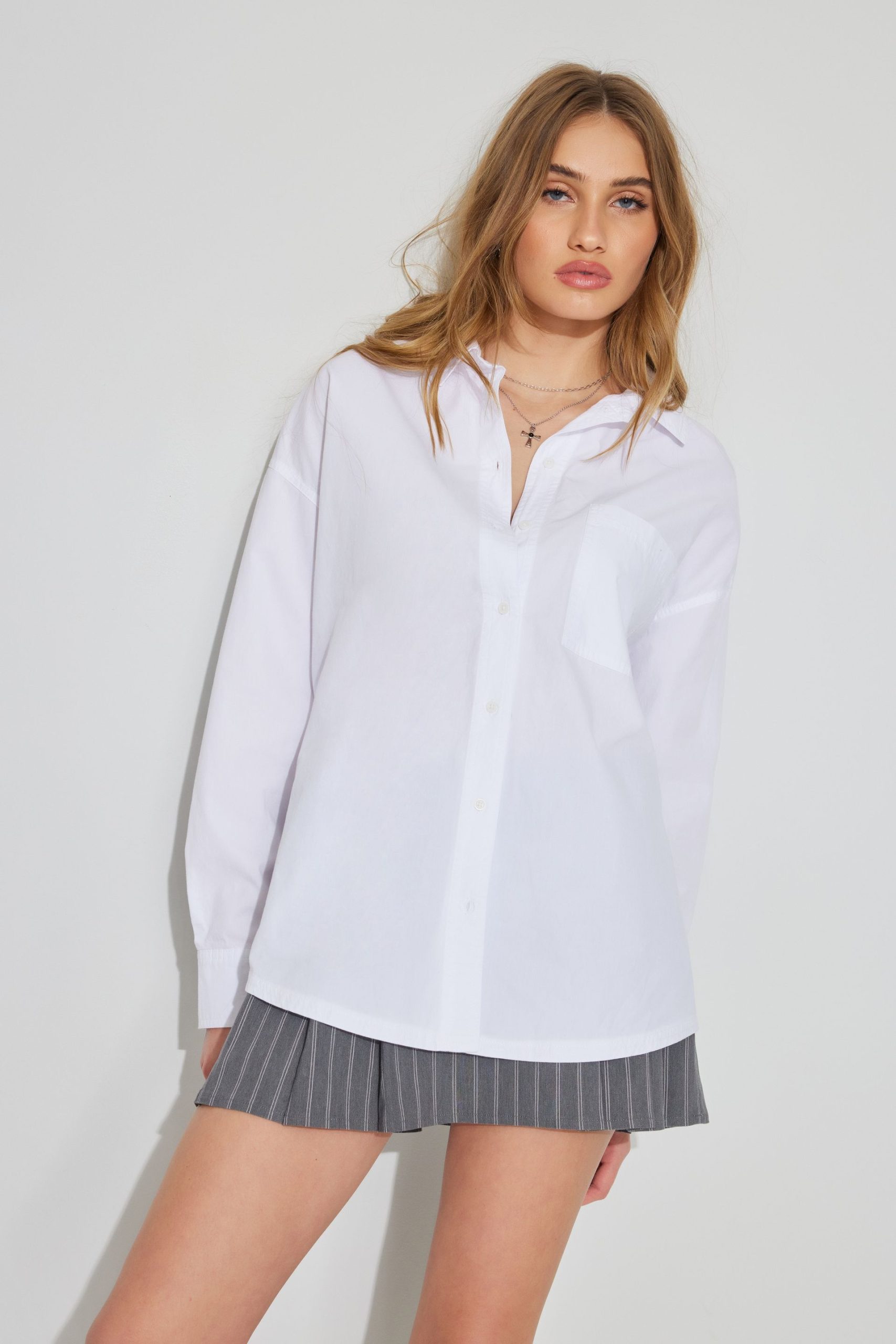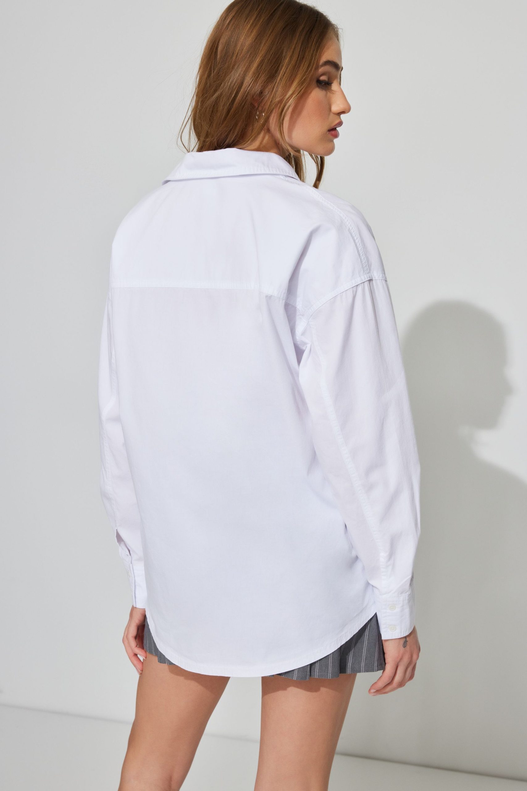 Charlie Button Up Shirt White women – This oversized work shirt is perfect worn open over a little top … think business wayyy casual. Features Spread collar Button closure Breast pocket Shirttail hem Size & Fit Fit: Oversized Length: Regular Model is wearing size S Materials & Care Content: 100% cotton Care: Machine wash, cold Imported