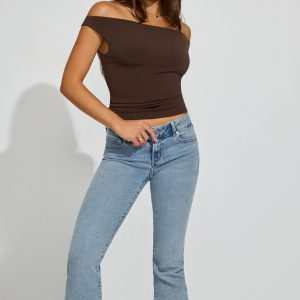 Clean Off Shoulder Top Brown women – Not our us being in our off shoulder era… Features Off-the-shoulder construction Double lined Size & Fit Fit: Fitted, stretchy Length: Regular Model is wearing size S Materials & Care Content: 93% recycled polyester, 7% spandex Care: Machine wash, cold Imported