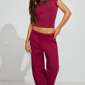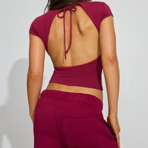 Crew Neck Open Back Short Sleeve Top Burgundy women – Imagine wearing this with a little pair of sweatshorts . Lives would be changed. Features Self-tie halter strap Open back Double lined Short cap sleeves Size & Fit Fit: Fitted, stretchy Length: Cropped Model is wearing size S Materials & Care Content: 80% cotton, 15% organic cotton, 5% spandex Care: Machine wash, cold Imported