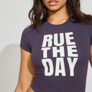 Cropped Crewneck T-Shirt Purple women – Girl who literally wears a crop top and jeans every day of her life. Features Classic crewneck Short sleeves Graphic printed at front Size & Fit Fit: Fitted, stretchy Length: Cropped Materials & Care Content: 80% cotton, 15% organic cotton, 5 spandex Machine wash, cold Imported