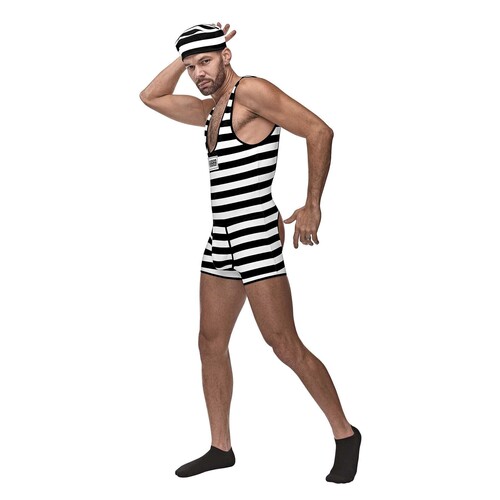 Silly, sexy prisoner costume. Convict #696969, is that contraband in your pocket or are you just happy to see the warden?
