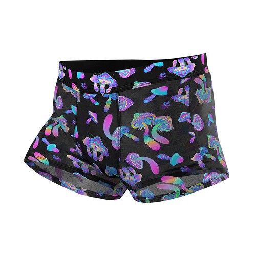 Take a glowing trip on the wild side in these sexy men’s shorts with supportive pouch and glows-under-blacklight magic mushroom print. Discreet shipping.