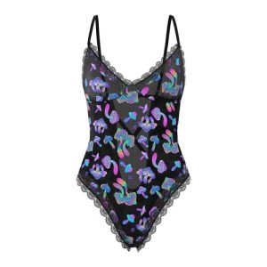 Step into the haze of the blacklight and wow your lover! This trippy mushroom teddy has high rise hips and a cheeky thong cut to show your body off.