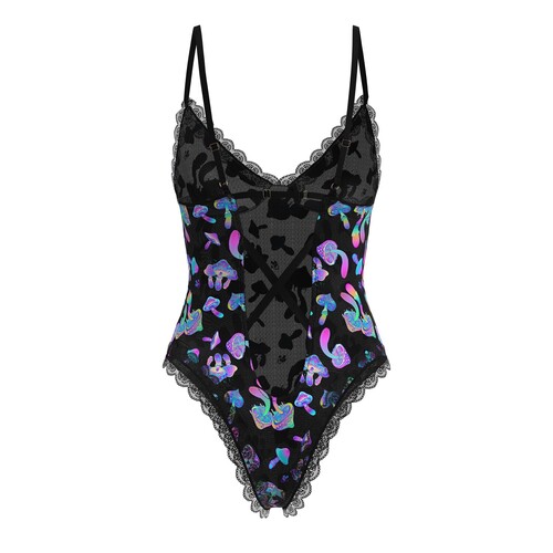 Step into the haze of the blacklight and wow your lover! This trippy mushroom teddy has high rise hips and a cheeky thong cut to show your body off.