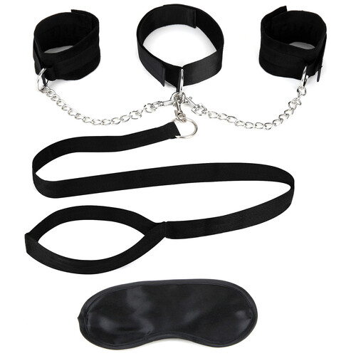 Train your playmate for maximum pleasure! Surrender control or call the shots with this collar, cuffs, and leash set. Get sexy bondage gear right here.