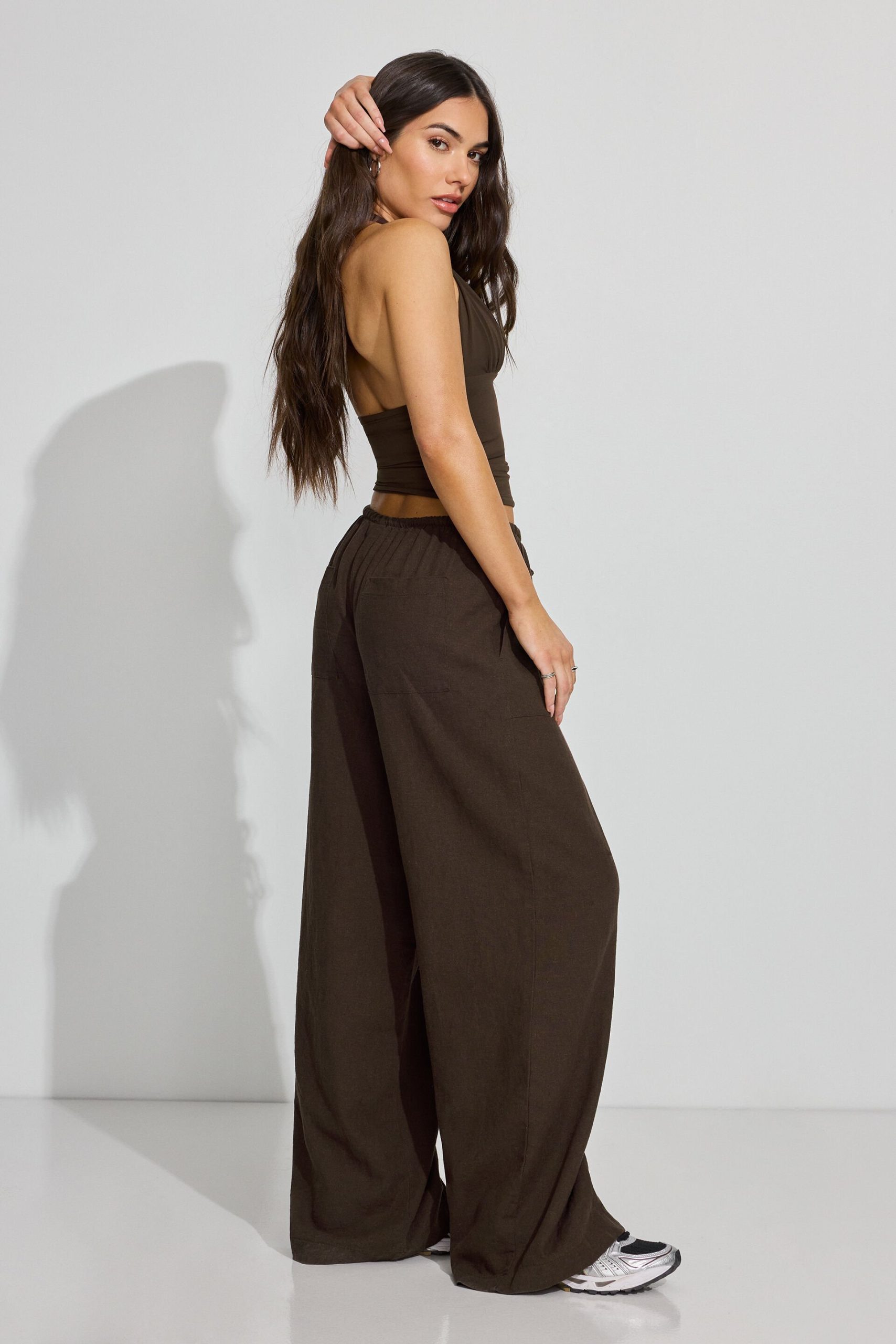 Millie Linen Pull-On Pants Brown women – So soft and with a baggy fit to better accentuate your little tops ! Features Self-tie drawstring at waistband Four-pocket styling Semi-sheer (in lighter colors) Size & Fit Fit: Relaxed Rise: 9.5