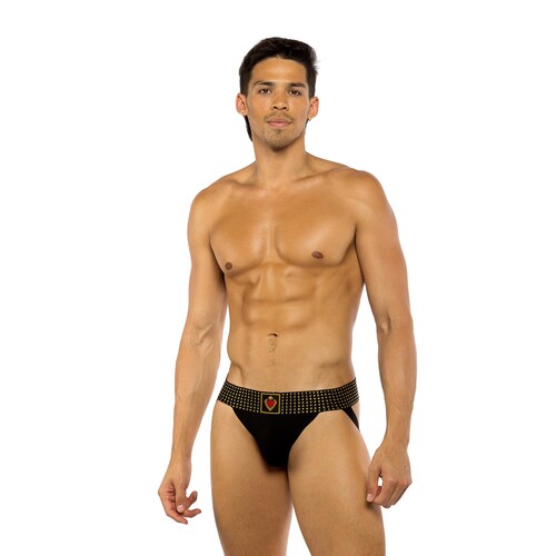 Treat your lover to some eye candy! The revealing Sacred Heart Jockstrap has a contoured pouch, open back & shiny gold studs. Discreet shipping.