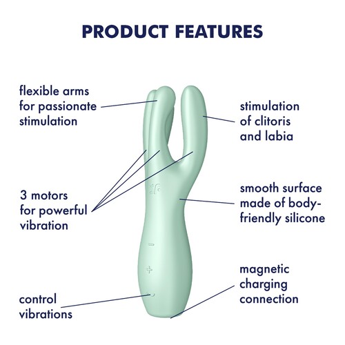 Unique 3-arm toy sends sensational vibrations to your clit & labia. 3 motors. 12 vibration modes. 60 minute run-time.