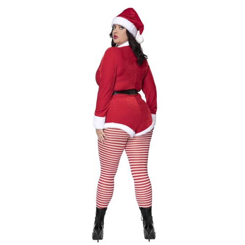 Velvet zip up Santa romper snatches your figure, giving you the ultimate sexy silhouette. Matching hat and faux fur trimming!