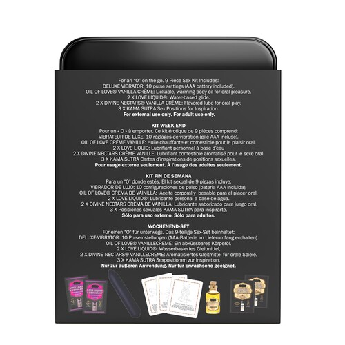 Unpack sexy romance with this naughty weekend getaway kit! Includes 10-function bullet vibe, kissable body oil, flavored lube, glide, cards, and more!